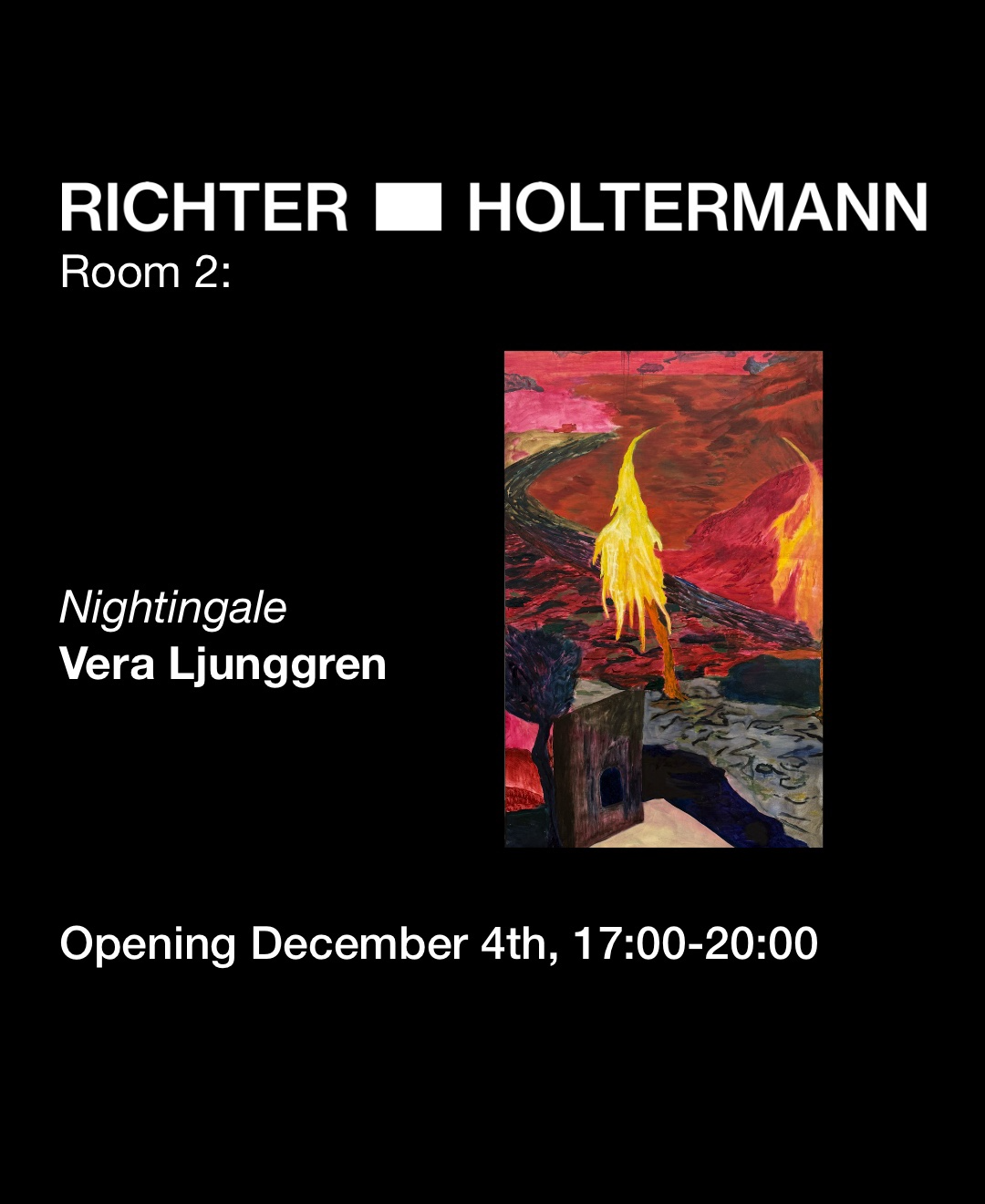 Vera Ljunggren was born in 2000 and is based in Stockholm. She studied at Konstfack and Pernby School of Painting, and completed an exchange at the Royal Danish Academy of Fine Arts. With Nightgale, she is exhibiting in Sweden for the first time.